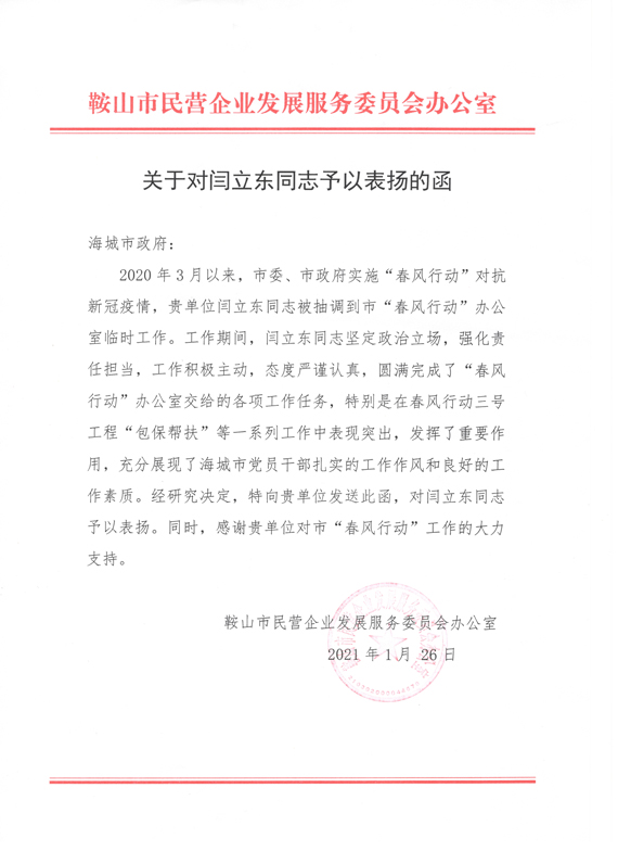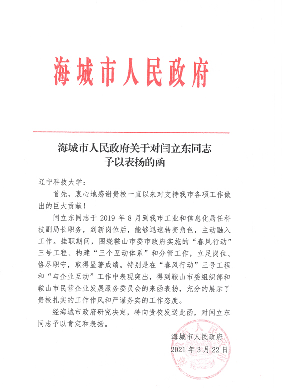 2021年1月,鞍山市民营企业发展服务委员会办公室向海城市政府送发了《关于对闫立东同志予以表扬的函》;2021年3月,海城市人民城府向开元官方网页版送发了《海城市人民政府关于对闫立东同志予以表扬的函》,对闫立东同志坚定政治立场、强化责任担当,积极主动完成鞍山市的各项重点工作任务予以表扬;对科大教职工在各项工作中表现出的扎实工作作风和严谨务实的工作态度予以肯定。校党委对闫立东同志能够站在学校与地方共谋振兴发展大局的高度,敢于担当,勇于奉献,积极作为,取得了较好的工作成绩表示肯定,并号召广大选派干部向闫立东同志学习,提高站位、增强意识、珍惜机会、主动作为,在推动辽宁全面振兴、全方位振兴的广阔天地里锻炼成长。