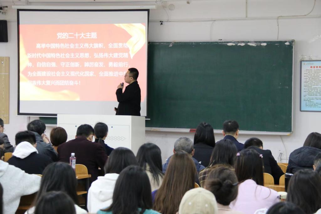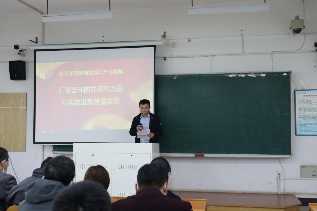 会议邀请经济与法律学院副院长温馨作题为《汇聚奋斗的共识与力量,切实推进高质量发展》的专题宣讲报告。温馨说,要汇聚共识、凝聚力量、推进发展,首先就要达成共识、理清脉络、明确任务。温馨为大家详细介绍了新时代新征程的历史沿革,深刻阐明了“新征程”的中心任务、总的战略安排以及未来五年的主要目标任务之间的层层关系,并引用习近平总书记在中共中央政治局组织生活会上的讲话,为大家阐明如何在开展工作中实现量变与质变的飞跃,深入推进高质量发展。