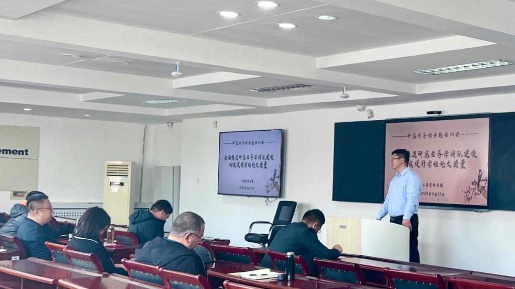 为适应研究生教育改革发展的新形势,切实履行导师立德树人根本职责,不断提升研究生学位论文质量,2024年3月12日,工商管理学院在明信楼B513室召开了以“全面推进研究生导学团队建设,切实提升学位论文质量”为主题的研究生导师培训会,学院领导及全体研究生导师参加会议。