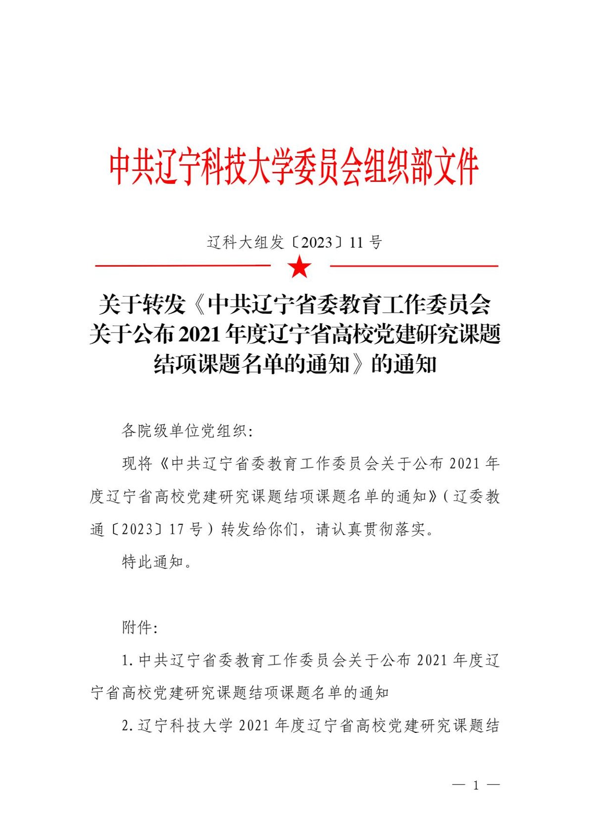 关于转发《中共辽宁省委教育工作委员会关于公布2021年度辽宁省高校党建研究课题结项课题名单的通知》的通知