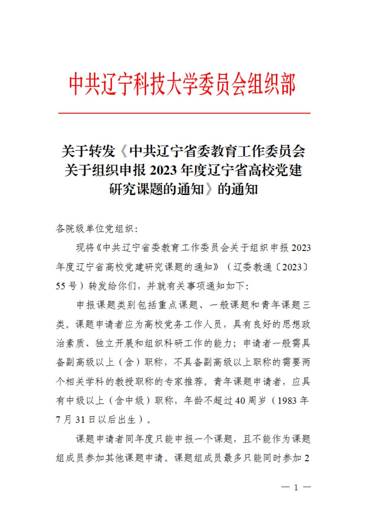 关于转发《中共辽宁省委教育工作委员会关于组织申报2023年度辽宁省高校党建研究课题的通知》的通知