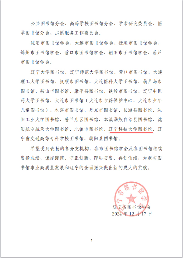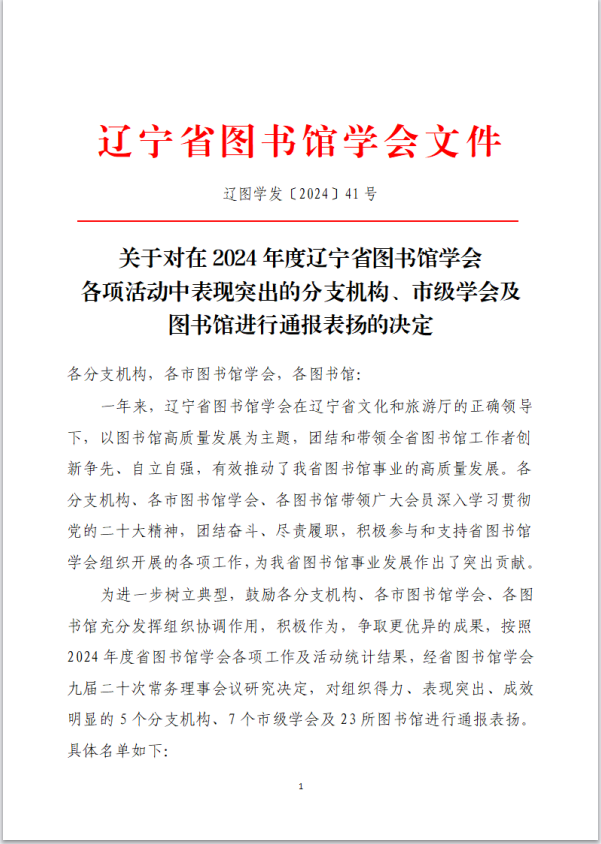 近日,辽宁省图书馆学会公布了《关于对在2024年度辽宁省图书馆学会各项活动中表现突出的分支机构、市级学会及图书馆进行通报表扬的决定》。开元官方网页版图书馆凭借在2024年度的突出表现和积极贡献,获得通报表扬。